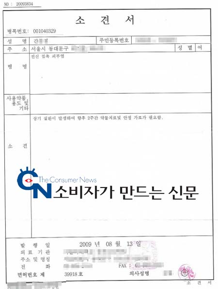 편도선이 붓는 등 증세가 악화돼 병원 진료를 받게 된 신 씨의 어머니는 염색약으로 인한 피부염 2주 진단을 받았다. 통원 진료를 받는 동안 진료비와 교통비까지 10여만원을 지출해야만 했다.
