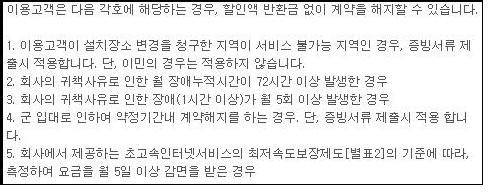 <소비자가 만드는 신문> 취재팀이 인터넷서비스업체 3곳, 위성방송업체 1곳, 유선방송업체 1곳을 대상으로 조사한 결과, 이용약관 상 위약금 없이 해지가능 한 사유에 '서비스가 불가한 지역으로 이전', '회사의 귀책사유로 인한 피해', '군 입대' 등이 전부였다. '사망'은 면제조항에 포함되지 않았다.