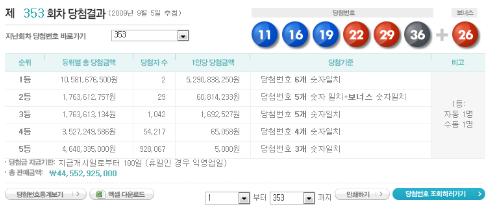 당첨번호 5개를 맞힌 3등은 1천42명(각 169만2천527 원), 4개 번호를 맞힌 4등은 5만4천217명(각 6만5천58 원)이다.