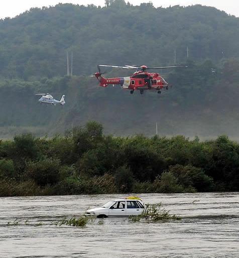 중앙119구조대는 이날 오전 10시22분께 사고지점에서 5㎞ 떨어진 삼화교 하류에 떠올라 있던 실종자로 추정되는 시신 1구를 헬기로 발견해 인양했다. 시신은 열 두 살난 아들을 살리고 힘이 빠져 실종된 서강일(40)씨로 확인됐다.