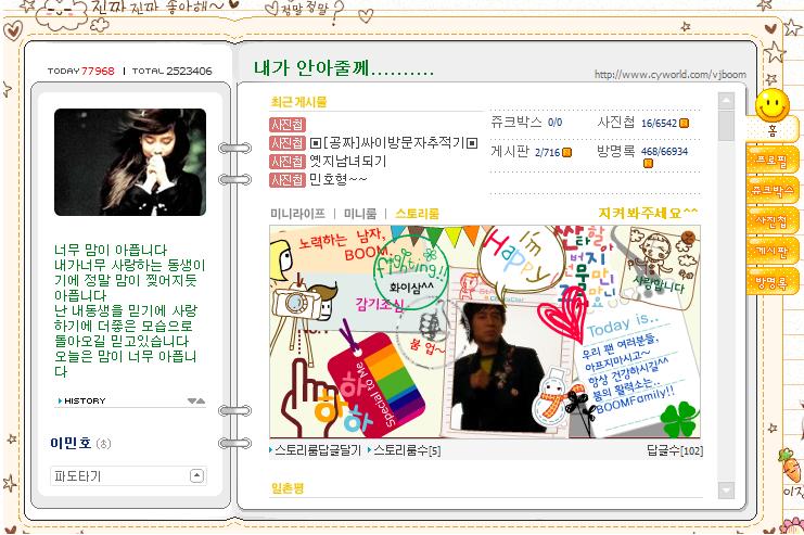 붐은 8일 자신의 미니홈피에 "너무 맘이 아픕니다 내가 너무 사랑하는 동생이기에 정말 맘이 찢어지듯 아픕니다"라는 심경을 전했다.