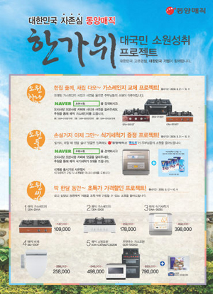 이번 이벤트는 고객의 소원을 들어 준다는 컨셉트로 동양매직이 포털사이트 네이버에 개설한 인터넷 카페 ‘요리사랑 오븐사랑(http://cafe.naver.com/magicovenlove.cafe)’ 에 오래된 가스레인지 사진과 사연을 올리거나 손 설겆이의 불편함 등에 대한 댓글을 쓴 고객들을 대상으로 10명을 추첨해 가스레인지와 식기세척기를 경품으로 증정한다.