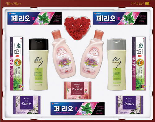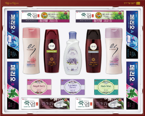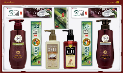 고급스러운 전통 문양의 패키지에 한방 샴푸 리엔, 엘라스틴 실크리페어, 죽염 치약 등 프리미엄 제품과 칫솔, 비누, 바디워시, 풋케어, 립케어 등 생활용품을 총망라한 품격 있는 선물세트. 리엔 한방 헤어로스컨트롤 자하진, 죽염 치약, 香테크, 풋케어 숄, 립케어 등 총 20종. (6만3천원)