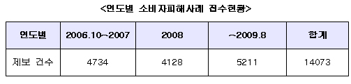 지난 2006년 10월 10일부터 올 8월 말까지 홈페이지, 전화, FAX, 이메일 등을 통해 접수된 소비자피해제보는 총 1만 4천 73건.