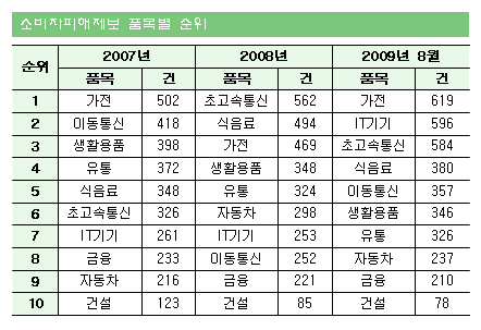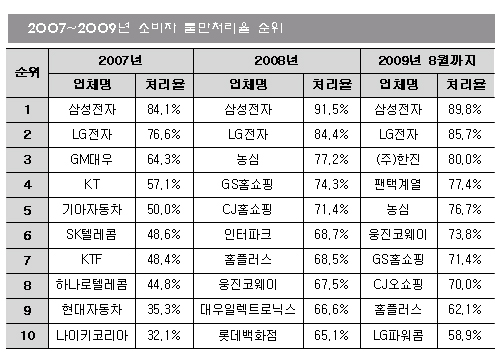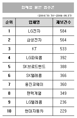 한편 2006년 10월 10일부터 2009년 8월 말까지 접수된 업체별 불만 접수건을 분석한 결과 소비자 불만ㆍ피해사례가 가장 많이 접수된 기업은 총 584건의 LG전자로 확인됐다.