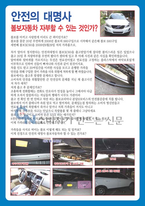 이에 대해 볼보 관계자는 "차량은 스웨덴에서 들어오고 자체검사 후 출고된다. 이 때  점검항목에는 차량 하부 점검도 포함돼 있다. 이처럼 불미스런 사건이 발생한 연유를 모르겠다. 보상규정상 차량 교환은 힘들다"고 답변했다.