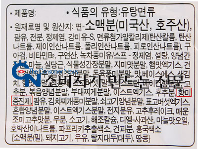 실제 라면의 경우 'MSG무첨가'라고 광고하는 포장지의 뒷면에 표기된 성분을 보면 놀라지 않을 수 없다. 스프에만 40여 가지가 넘는 물질을 포함하고 있으며 그 중에는 '조미소고기분말', '혼합양념분말', '향미증진제, '육수맛조미베이스, '조미양념분', '햄맛엑기스' 등 정체모를 이름의 혼합물질도 다수 포함돼있다.