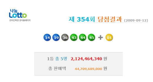 URL복사 기사공유하기 스크랩 프린트 메일보내기 글씨키우기 나눔로또 12일 제354회 로또복권 추첨 결과 당첨번호는 14, 19, 36, 43, 44, 45번이 이다. 2등 보너스번호는 '1' 번이다. 6개 번호를 모두 맞힌 1등 당첨자는 5명으로 각각 21억2천446만 4천340원을 당첨금으로 받게 된다. 당첨번호 5개와 보너스 번호를 맞힌 2등은 34명이며 5천207만 205원씩 받는다. 당첨번호 5개를 맞힌 3등은 1천014명(174만5천944원), 4개 번호를 맞힌 4등은 5만4천318명(6만5천187원), 당첨금 5천 원을 받는 5등은 93만195명이다. 저작권자 © 소비자가 만드는 신문 무단전재 및 재배포 금지 이완재 기자 다른기사 보기 URL복사 기사공유하기 주요기사 SK텔레콤, '1인당 10만원' 보상안 불수용..."재무적 부담 감당 어려워" 위메이드, 원화 스테이블코인 전용 ‘스테이블넷’ 테스트넷 공개 크래프톤, ‘배틀그라운드 모바일’·‘킹 오브 파이터즈’ 컬래버레이션 진행 하나증권 지난해 순이익 2120억 원…전년 대비 6% 감소 금융투자협회 조직개편 단행, K자본시장본부·대외협력부 신설 함영주 하나금융 회장 "비은행 수익성 회복되면 ROE 12% 도달 가능"