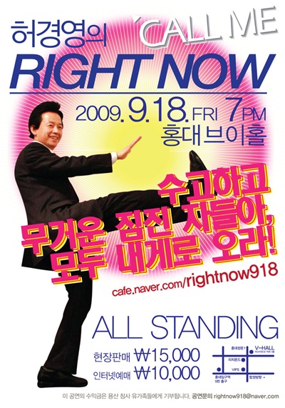 싱글앨범 ‘콜미’(call me) 발표와 콘서트 개최로 인기를 모으고 있는 허경영이 새 싱글앨범을 오는 18일 오후 7시 홍대 V홀에서 열리는 첫 콘서트 ‘허경영의 Right now’에서 처음으로 공개한다.