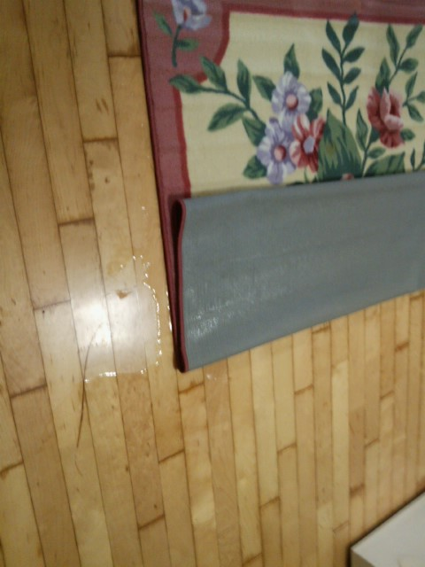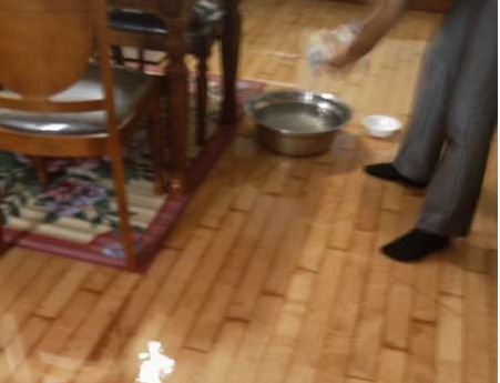 ▲정수기에서 흘러 내린 물로 흥건해진 바닥
