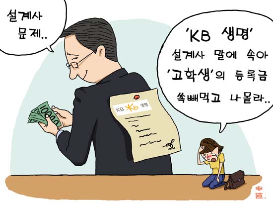 [소비자가 만드는 신문=이대열 화백]보험 설계사가 등록금을 벌기 위해 아르바이트하는 어려운 고학생에게 적금인양 소개해 거액의 장기 보험상품에 가입시키고 연락마저 끊어 버렸다는 제보가 접수됐다.