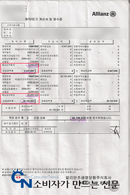 알리안츠 생명보험은 지난 11일 문서를 통해 '가입한 상품에 대해 고객이 약관을 충분히 확인할 수 있도록 3개월의 기간을 부여했으나 고객이 이를 확인하지 않았으며 사문서 위조 등의 고소 건에 대해 검찰청의 혐의없음 처분을 받았다. 고객의 주장은 신빈성이 없으므로 기납부보험료의 전액 환급 요청을 수용할 수 없다'는 입장을 밝혔다.