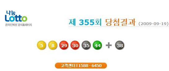 URL복사 기사공유하기 스크랩 프린트 메일보내기 글씨키우기 로또 355회 1등 당첨번호는 '5, 8, 29, 30, 35, 44'로 정해졌다. 보너스 번호는 38. 저작권자 © 소비자가 만드는 신문 무단전재 및 재배포 금지 스포츠 연예팀 다른기사 보기 URL복사 기사공유하기 주요기사 SK텔레콤, '1인당 10만원' 보상안 불수용..."재무적 부담 감당 어려워" 위메이드, 원화 스테이블코인 전용 ‘스테이블넷’ 테스트넷 공개 크래프톤, ‘배틀그라운드 모바일’·‘킹 오브 파이터즈’ 컬래버레이션 진행 하나증권 지난해 순이익 2120억 원…전년 대비 6% 감소 금융투자협회 조직개편 단행, K자본시장본부·대외협력부 신설 함영주 하나금융 회장 "비은행 수익성 회복되면 ROE 12% 도달 가능"