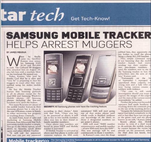 경찰은 이달초 2명의 남성과 1명의 여성으로 구성된 일당을 검거했다.이 단순 강도 사건이 케냐의 언론에 대대적으로 보도됐다. 일부 신문이 1면 톱기사로 실었다.이유가 있었다.삼성 휴대전화가 이들 체포에 1등 공신역할을 했기 때문이다.
