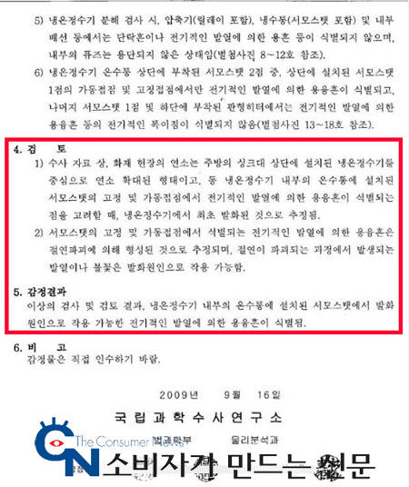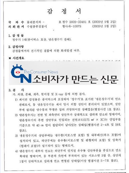 ▲ 해당 정수기에 대한 국립과학수사연구소의 감정서