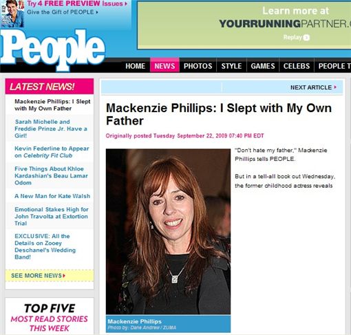 메켄지 필립스는 자서전을 통해 19세 때 결혼식 전날 아버지와 서로 마약에 취한 채 처음으로 동침했다고 밝혔다.