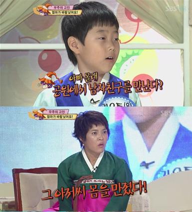 지난 3일 방송된 SBS '스타주니어쇼 붕어빵'에 출연한 김우주 군은 "엄마가 아빠 몰래 공원에 가서 남자친구를 만나는 것 같다"며 "어디 간다고 해서 따라가 보니 아저씨가 있었다. 엄마는 아저씨 몸을 만졌다"고 폭로했다.