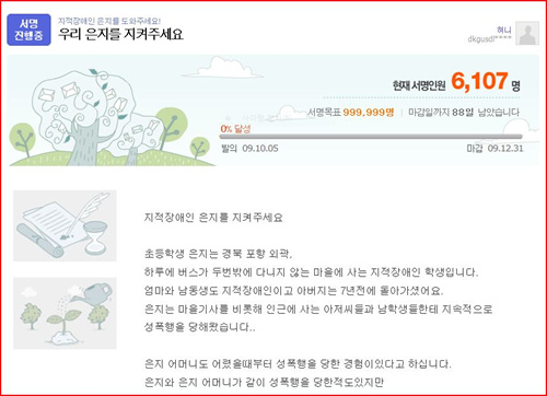 한 네티즌은 ‘우리 은지를 지켜주세요’라는 네티즌 서명을 제안, 5일 오후 3시15분 현재 6107명이 서명했다.