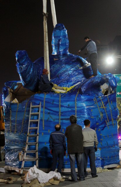 오는 한글날 공개되는 세종대왕 동상이 4시간여의 수송작전 끝에 6일 오전 서울 광화문광장에 도착, 설치되고 있다.