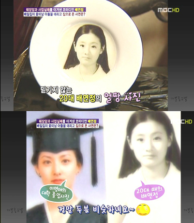 이날 배연정은 집안을 공개하며 20대 처녀시절 사진을 보여줬다. 배연정은 "이 사진이 공개된 뒤, 이영애다 심은하다는 오해도 받았지만 내 사진이다"며 "나라는 것을 알고 실망하셨겠다. 젊은 시절에는 한 미모했는데 나이가 드니 망가지게 된다"고 전했다.