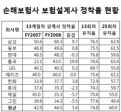 설계사 정착률과 직결되는 13회차 보험계약 유지율을 보면 생보사는 2007년 회계연도 77.1%에서 2008년 77.1%에서 78.3%로 4%포인트 하락했다. 손보사는 76.4%에서 74.8%로 1.6%포인트로 하락한 것으로 나타났다.