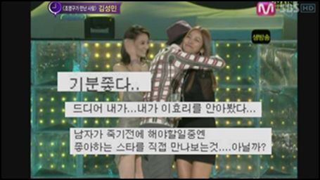 이어 김성민은 "남자가 죽기 전에 해야 할 일 중엔 좋아하는 스타를 직접 만나보는 것 아닐까"라며 "기분좋다"고 덧붙일 정도로 ‘이효리의 열혈팬’임을 자청했다. <사진-SBS 한밤의TV연애 방송 캡쳐>