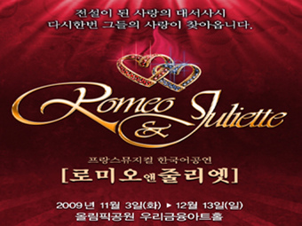 프랑스 뮤지컬 ‘로미오앤줄리엣’의 한국어 공연이 오는 11월 3일 올림픽공원 우리금융아트홀(올림픽역도경기장)에서 앙코르 공연된다. 프랑스 뮤지컬 ‘로미오앤줄리엣’의 한국어 공연은 올 7월 예술의전당에서 초연된 바 있다. 이번 공연에는 로미오앤줄리엣으로 만난 예비부부 임태경 ‧ 박소연을 비롯, 신예 배우 전동석과 최지이가 각각 로미오와 줄리엣을 맡아 눈길을 끈다.