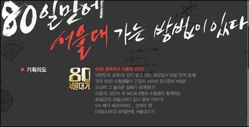 한편, '80일만에 서울대가기'는 방송 외에도 프로그램 홈페이지를 통해 출연 강사진들의 동영상 강의 서비스를 제공할 예정이다. <사진출처-tvN 홈페이지>