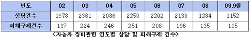 소비자원에 따르면 자동차 정비관련 소비자 상담 건수가 지난 2002년부터 2007년까지 해마다 2천 건 이상이었다. 2008년 한해 1천284건으로 주춤하긴 했으나 올해는 9월까지 이미 1천152건의 상담이 이뤄졌다.