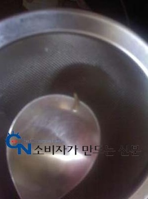 ▲ 구더기로 보이는 이물질이 떠있는 보리차 냄비(위) 수저로 뜬 이물질(아래)