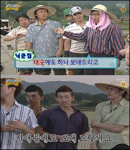 모내기를 마친 '무한도전' 멤버 유재석, 박명수, 정준하, 정형돈, 노홍철, 전진, 길은 2PM에 고마움을 전하며 "2PM에게도 쌀을 줘야겠다"고 입을 모았다. 또 자막을 통해 닉쿤의 고향인 태국을 비롯해 "시애틀에도 보내드릴요..."라고 공지, 촬영 당시와 상황이 달라져 현재 팀에서 탈퇴하고 미국 시애틀에 머무르고 있는 재범에게도 쌀을 보내주겠다는 의사를 전했다. <사진출처-MBC 무한도전 방송 캡쳐>