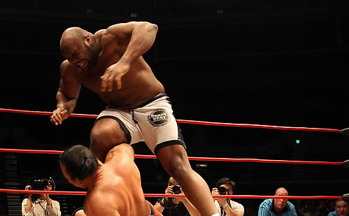 26일 송파구 방이동 올림픽공원 제2경기장에서 열린 고 김일 추모 프로레슬링대회 ‘포에버 히어로(Forever Hero)’ 마지막 메인 매치에 출전한 이왕표는 현란한 드롭킥과 돌려차기, 들어 매치기로 밥샵을 몰아붙였다.