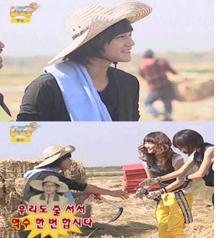 ‘꽃보다 남자’ ‘에덴의 동쪽’의 김범은 정준하와 함께 일일시트콤 ‘거침없이 하이킥’에 출연했던 인연으로 추수 현장을 찾아 깔끔한 블랙 정장 차림에서 작업복에 긴 장화로 갈아 신고 낫을 든 채 추수에 합류했다.
