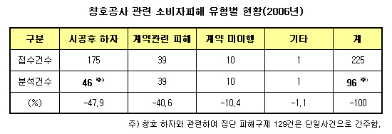 ◆시공 후 ‘누수’로 인한 피해 많아=2006년 창호관련 소비자피해구제 접수건 중 시공 후 하자가 발생한 46건을 세부적으로 살펴보면, 창호 누수로 마루바닥 등에 손상이 발생한 하자가 31건으로 전체의 67.4%를 차지하고 있으며, 창호틀 변형, 결로 발생 등의 순으로 나타났다.