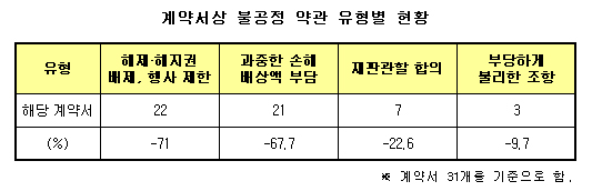 또 ‘재판관할의 합의 조항’이 있는 계약서 7개(22.6%), ‘소비자에 대하여 부당하게 불리한 조항’ 이 포함된 계약서 3개(9.7%) 등으로 소비자에게 일방적으로 불리한 조항을 담은 약관을 사용하고 있는 것으로 드러났다.