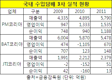BAT코리아 작년 영업이익은 670억원으로 전년도 1천105억원 적자에서 흑자로 돌아섰다. JTI코리아도 작년 영업이익 51억원으로 전년도 152억원 적자에서 두 배 이상 증가하며 흑자 전환했다.