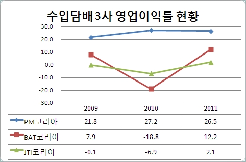실질적 수익성을 나타내는 영업이익률도 PM코리아, BAT코리아, JTI코리아 각각 26.5%, 12,2%, 2.1% 순으로 큰 차이를 보였다.