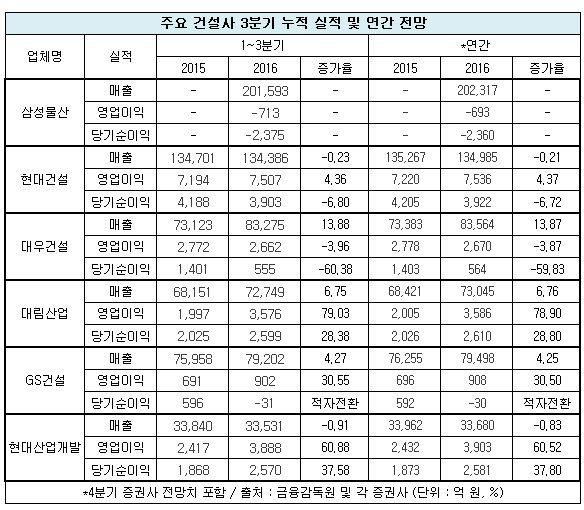 3분기 말 기준으로 상반기까지 해외 법인 손실을 반영한 삼성물산은 적자를 기록했다. 대우건설 역시 해외 사업장의 손실을 반영하면서 전년 동기 대비 영업이익이 소폭 감소했다.