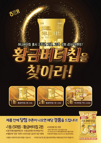 ‘황금버터칩을 찾아라!’는 제품 내 황금버터칩 쿠폰을 찾는 이벤트로, 황금 총 200돈을 증정할 예정이다. 쿠폰에 적힌 코드를 이벤트 홈페이지에 입력하면 참여할 수 있으며 내년 1월까지 진행된다.