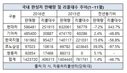 현대자동차(대표 이원희)와 쌍용자동차(대표 최종식)는 리콜대수가 전년 대비 증가한 반면 기아자동차(대표 이형근), 한국지엠(대표 제임스 김), 르노삼성자동차(대표 박동훈) 등 3개사는 큰 폭의 감소세를 보였다.