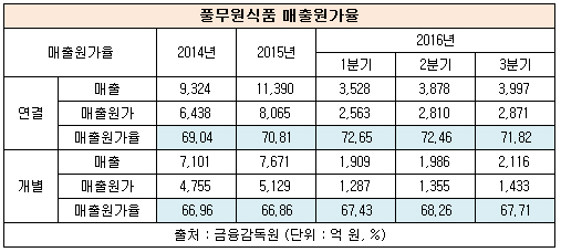이에 대해 풀무원 관계자는 “매출원가에 콩나물, 계란의 원가만 반영되는 것이 아니기 때문에 매출원가율이 변동 없다고 해서 가격 상승 요인이 없다고 볼 수는 없다”고 설명했다.
