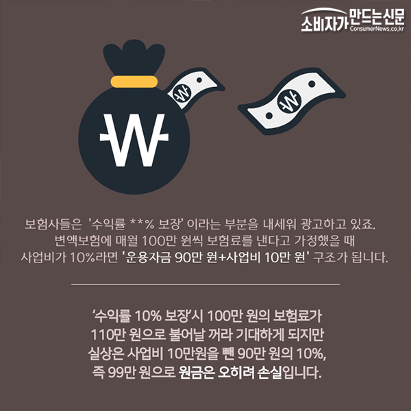 ‘수익률 10% 보장’시 100만 원의 보험료가 110만 원으로 불어날 꺼라 기대하게 되지만 실상은 사업비 10만원을 뺀 90만 원의 10%, 즉 99만 원으로 원금은 오히려 손실입니다.