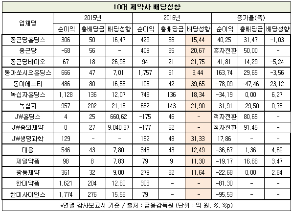 금융감독원에 따르면 지난해 매출 기준 상위 10개 제약사 오너 가운데 이장한 종근당 회장, 강정석 동아제약 회장, 허이섭 녹십자 회장, 이경하 JW중외제약 회장 등 4명이 올해 10억 원 이상을 배당 받는 것으로 나타났다.