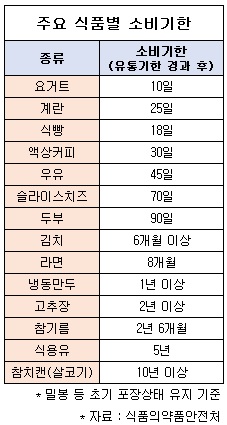 또한 고추장(2년), 참기름(2년 6개월), 식용유(5년), 살코기참치캔(10년 이상) 등 소비기한이 길게 책정된 식품도 다수였다.