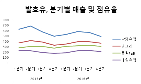 남양유업과 빙그레, 동원F&B가 1~3위를 지키고 있고 매일유업이 4위로 치고 올라오는 양상이다. 이외에 풀무원다논과 푸르밀, 서울우유가 혼전을 벌이고 있다.