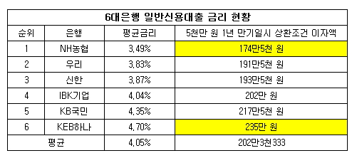 6대 시중 은행 가운데 일반신용대출 평균 금리가 가장 낮은 곳은 NH농협은행(행장 이경섭)인 것으로 나타났다. 반면 KEB하나은행(행장 함영주)은 연 5%에 육박해 대조를 이뤘다.