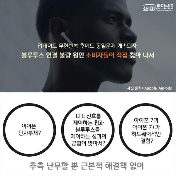 “출퇴근 시 차 안에서 블루투스를 열결해 음악 듣는 게 낙인데 아이폰7+ 개통 후 끊김 현상으로 노래 1곡 제대로 들을 수가 없네요” - 서울 강북구 미아동 이 모 씨.