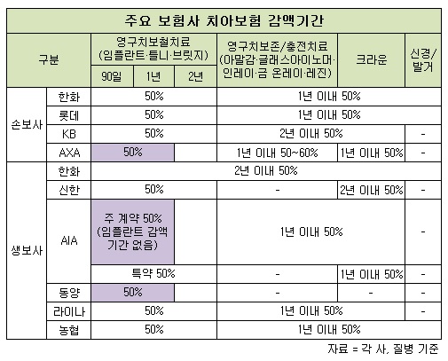 이 경우 기간이 가장 짧은 것은 AXA손보와 AIA생명, 동양생명이다. 두 보험사는 영구치보존·충전치료에 대해 1년까지 보험금을 50% 축소해 지급하고 그 이후부터는 전액 지급하고 있다. AIA생명의 경우 주 계약에 한해서 임플란트의 감액기간이 없는데 보철치료 특약 가입시에는 2년까지 50%만 지급한다.