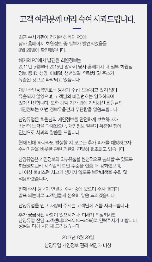 최근 경찰에서 기업 홈페이지를 해킹하는 해커를 구속해 확인한 결과 남양유업 가입자 정보가 발견된 것이다. 남양유업은 “최근 수사기관이 검거한 해커의 PC에서 당사 홈페이지 회원정보 중 일부가 발견됐음을 28일 확인했다”고 설명했다.
