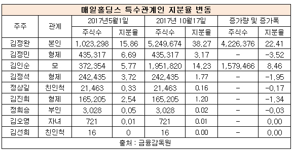 김정완 회장은 매일홀딩스 지분율은 지주사 전환 당시 15.86%에서 지난해 10월 38.41%로 22.41%포인트나 늘었다. 총 주식수가 두 배로 증가하면서 형제 등 나머지 특수관계인들의 지분율은 절반으로 뚝 떨어졌다.